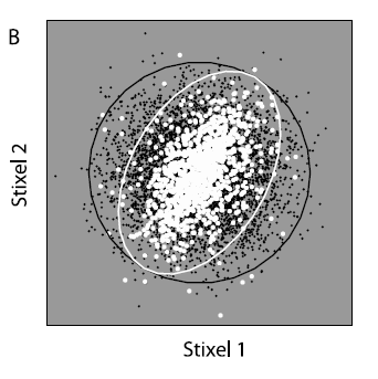 Here is Figure 4B of Schwartz et al. 2006 which illustrates the idea. The stimulus ensemble is illustrated in black, while the STE is illustrated in white. The variance of the STE is noticeably smaller in the -30 degree direction, and an eigenvalue decomposition of the covariance of the STE would thus find a small eigenvalue corresponding to the [cos(-pi/6),sin(-pi/6)] eigenvector. Thus there is an inhibitory symmetric nonlinearity in the [cos(-pi/6),sin(-pi/6)] direction. STC is most useful in systems with quadratic nonlinearities, for example to determine the properties of complex cells in V1.