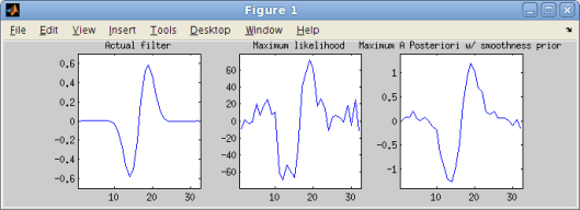 Using a prior on \mathbf{w} and finding the maximum a posteriori estimate of \mathbf{w} alleviates overfitting. Gaussian priors of the form N(\mathbf{w}|0;(\lambda \mathbf{A})^{-1}) allow the expression of prior knowledge that the weights are of small magnitude (A = I) or that the weights are smooth (A = D, a second order finite difference operator), for example. The set of functions allow the determination of the hyperparameter \lambda through k-fold cross-validation.