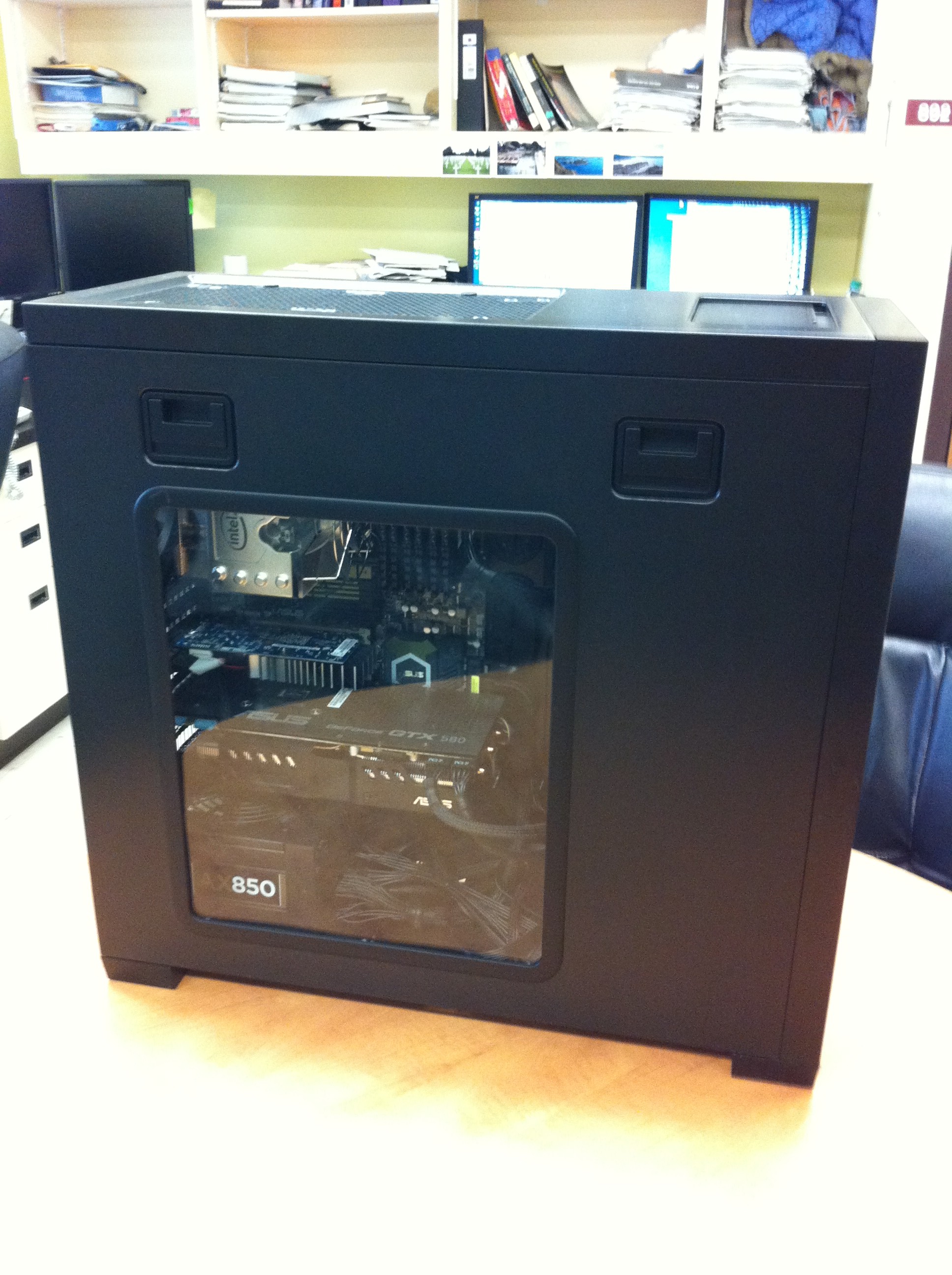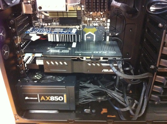Two caveats about the card though. First, it’s huge. That’s why I had to buy the very large case that you see (Corsair Obsidian series). Second, it takes a lot of power. Something like 250W. Coupled with the second video card I put in there for display purposes, I went with a 850W power supply. They make modular power supplies now where the wires are removable, which is great because the interior of the computer is much cleaner and accessible now. Normally this wouldn’t be a big deal, but the case has a window on it to see inside! How awesome is that?