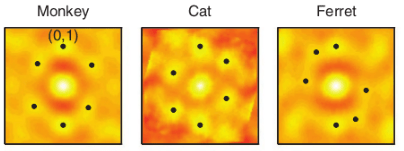 Perhaps the key finding in the paper is that the orientation map has a very peculiar, non-random spatial pattern. The autocorrelation of the maps, shown above, show 6 distinct peaks, across several subjects and species. That means that underneath the beautiful patterns of pinwheels and wild transitions lies an underlying hexagonal grid, not unlike the reptiles illustrated by M.C. Escher.