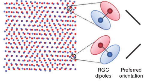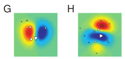 But where does this hexagonal map come from? The authors propose that the map is ultimately inherited from the hexagonal tiling pattern of retinal ganglion cells. To generate orientation columns, they propose that the ON- and OFF- mosaics have slightly different periods and relative angles. As you can see below, two superimposed hexagonal grids with slightly different periods and angle cause Moiré interference patterns. This is explained eloquently in the News and Views article by Spencer L Smith (incidentally, curator of the excellent Labrigger blog) and Ikuto T Smith. By the statistical connectivity hypothesis, the orientation selectivity of a simple cell is seeded by the pooling of a handful of retinal ganglion cells in close physical proximity to one another. The Moiré interference pattern coupled with statistical connectivity causes pairs of ON- and OFF- retinal ganglion cells (dipoles) of similar orientation to cluster together spatially.