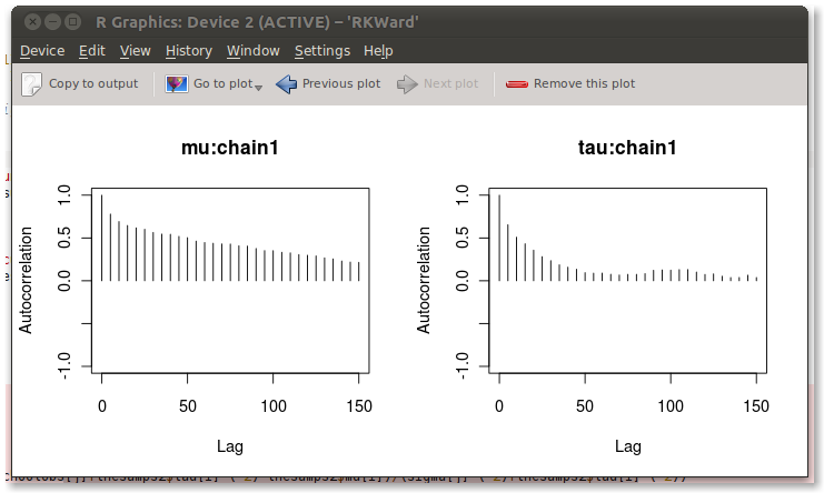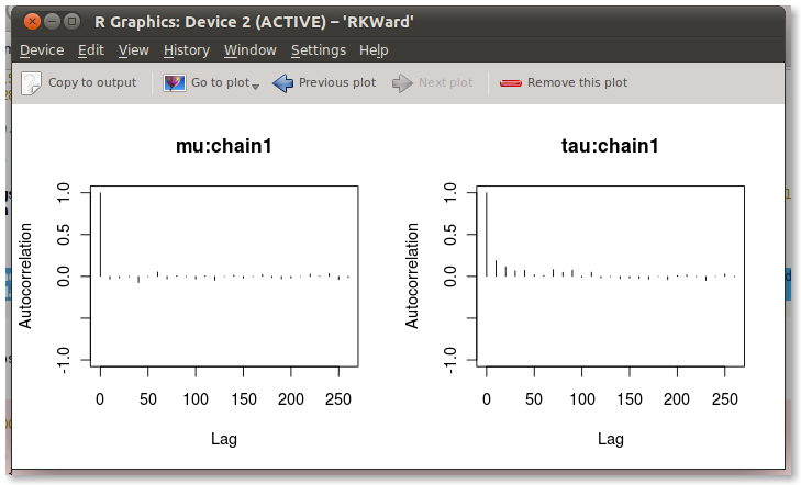 That looks terrible. Clearly this chain has not converged; mu looks terrible, in particular. You can do a smörgåsbord of convergence diagnostics through a wizard-like interface with codamenu(). This allows you, for example, to plot the autocorrelation of the chain: