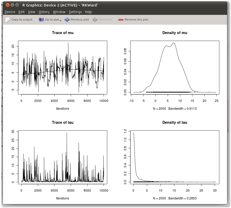 thesamps <- coda.samples(jagresult,c('mu','tau'),n.iter=10000,thin=10,progress.bar="gui")