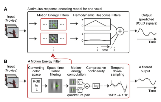 The idea is to train an encoding model using fMRI responses during natural movies. Then the goal is to decode what natural movies were presented to an observer based on a second set of fMRI responses (see movie above). Importantly, the second set of fMRI responses was not used during training. Furthermore, there is no overlap between the presented stimuli in the training and decoding sets. This is a pretty tough test of the ability of the encoding/decoding models to extrapolate.