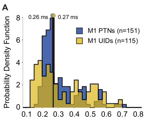 In summary, our study confirms for the awake monkey previous findings in the cat motor cortex: thin spikes can originate from pyramidal neurons. It extends this observation to PTNs [pyramid tract neurons] recorded in a secondary motor area. We conclude that spike duration alone may not provide a reliable indication of cell type, at least in areas of primate cortex containing PTNs, but more likely reflects discharge properties shared between cortical interneurons and some pyramidal neurons.