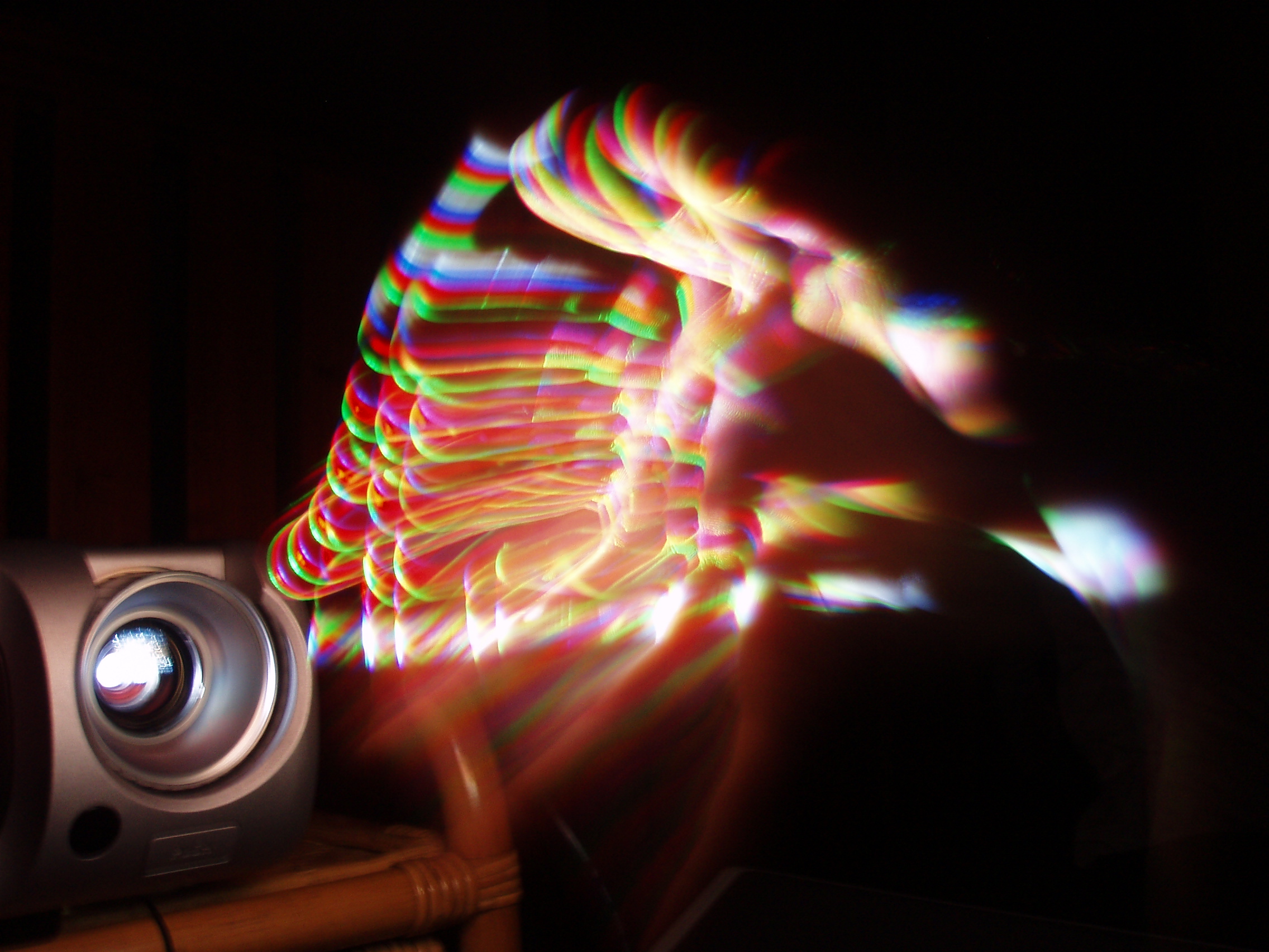 Importantly, however, flicker can occur from a different source. If you look at the image of a DLP projector, and move your gaze outside the screen, you will notice fringes of color. This also occurs if you wave your hand in front of the projector, as shown above. In a single-chip DLP projectors, the DLP chip produces black and white images, and the colors red, green and blue are created by a spinning color wheel. Wikipedia states that the wheel of common projectors can rotate at 4 or 5x the frame rate of the signal, so 240 or 300 Hz. This is a very high rate, yet clearly you’re able to discriminate such large temporal frequencies.