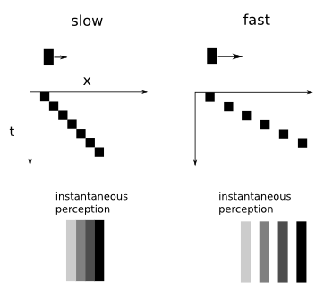 On the right, the same line is now moving faster. Now the retinal image shows a faded trail of the path of the line; this will be interpreted as choppy when viewed by a human observer. The problem is that a video game video rendering pipeline generates instantaneous snapshots of the video game world at a set sampling frequency (say 30Hz). But the Nyquist-Shannon sampling theorem implies that if things happens in the virtual world at higher temporal frequencies than half of the sampling rate (the Nyquist frequency), the result will be temporal aliasing, the creation of artifacts from inadequate sampling.
