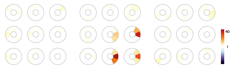 We replotted this data as color coded tuning mosaics. The mosaics highlighted in green below are color coded representations of the information shown in the tuning curve data above. For each optic flow type, each mosaic represents a tuning curve at a given position inside the receptive field. This cell shows some tuning for downwards motion, as well as some expansion tuning, and deformation tuning.
