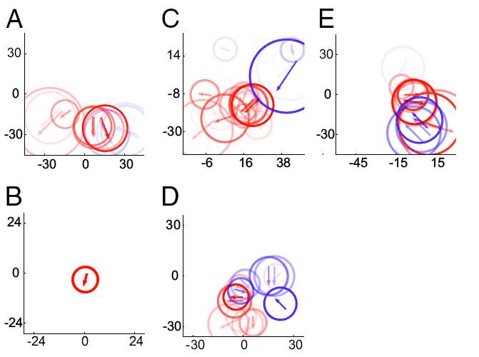Now that we were confident that we had a good model of MST, we could reconstruct the receptive fields of these cells. Here’s several examples. The cell in A is the same as the second cell I showed above, while the cell in B is the very first cell I presented. The others are all selective for expansion, but they have very different receptive field organizations. It’s really quite amazing the diversity of RFs that you find. From this we concluded that MST neurons are probably not detectors of canonical optic flow fields per say, but are really detectors of a small number of motion directions.
