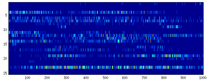 Here W is the covariance matrix of the change in position from frame to frame. Again, such data is easy to simulate; a simple call to randn, then cumsum will do the trick. Thus, I simulated a path through an open 2d environment and the response of 25 place cells like so: