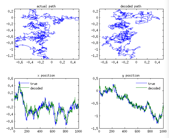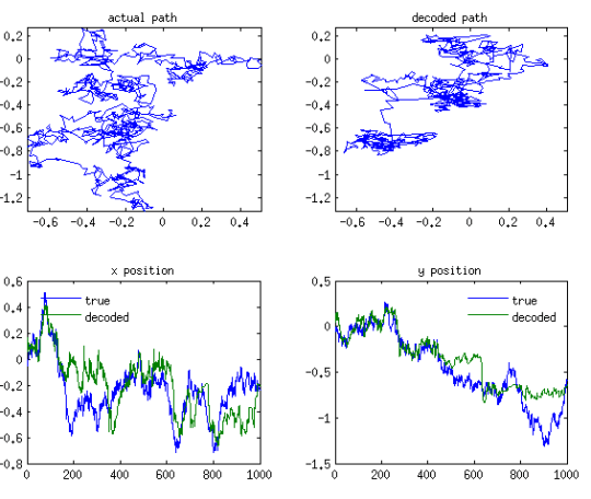 In the last post, I discussed using an extended Kalman filter to decode place cells, based on the algorithm published in Brown et al. (1998). The results looked pretty good. EKFs are certainly better than population vector approaches that don’t consider the sequential nature of the decoding task. The fact that the path of the rat must be continuous should be certainly be used in the decoding process.