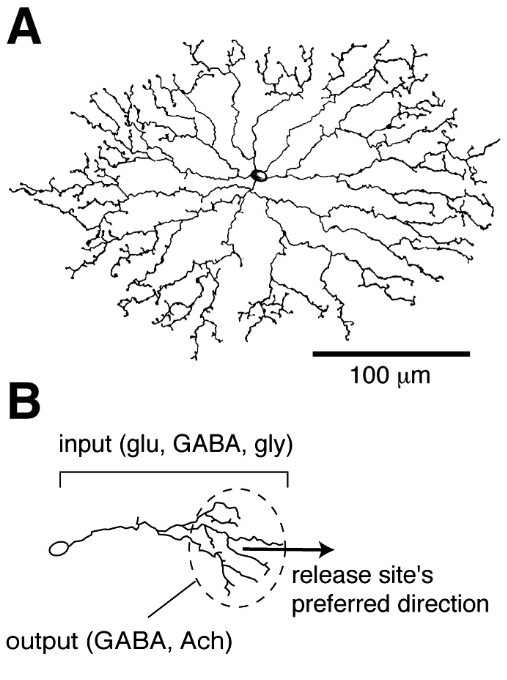 SACs are pretty fascinating. They themselves are direction selective. What’s more, they’re direction selective at a smaller scale than a single neuron. What’s that you say? Well, basically these SACs have dendritic fields which are relatively flat and almost radially symmetric (above). Each dendrite is relatively electrically isolated from the other. Incoming synapses occur all over each dendrite, while output synapses (towards DSGCs) are restricted to the parts of the neuron most distal from the soma. Each dendrite is selective for a motion vector going from the soma to the most distal part of the dendrite.