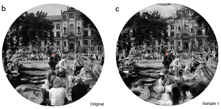 These metamers appear psychophysically indistinguishable, despite being quite clearly different (example below; you need to fixate for this to work). You can do this metamer business over different assumed scales; as it turns out, the matching is most convincing when the metamers are compared at scales similar to those of V2 neurons.