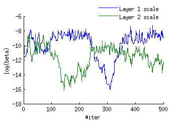 Depending on initial conditions, then, either the first layer gets updated first, or the second layer gets updated first. Then one layer is over-adapted, and the algorithm switches to fitting the other layer. But the initially updated layer grabs a lot of the variance, so it becomes difficult to update the other layer. The fitting algorithm gets stuck with an undertrained first layer and an overtrained second layer, or vice-versa.
