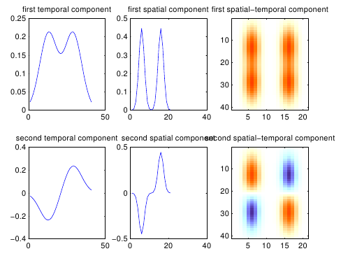 Well, we might want to assume that the components are sparse, localized in space and time, unimodal, etc. But really the simplest assumption that does the trick is to simply assume that each component is positive. Running Matlab’s non-negative matrix factorization (NNMF) implementation on this example returns the kind of decomposition we were looking for: