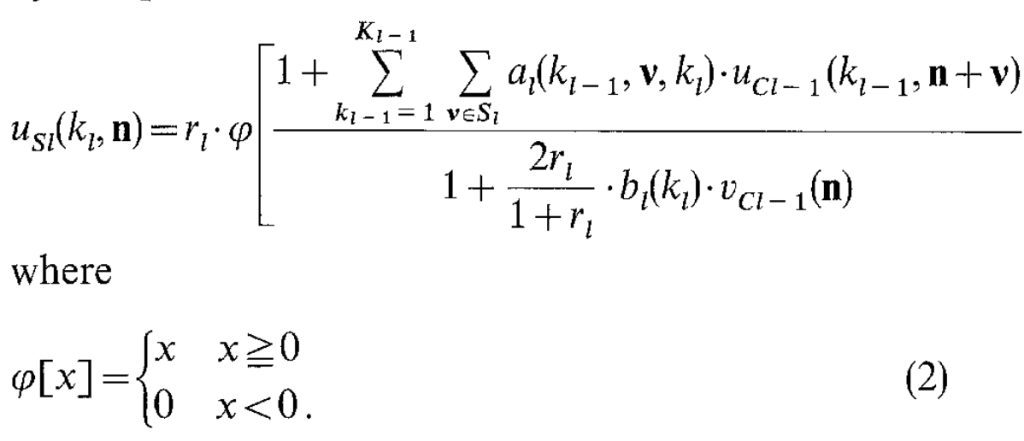 The Neocognitron also introduces what may be the defining features of modern CNNs: parallel feature maps (here called planes) and weight sharing. This is most clearly seen in the selectivity operation for S-layers, which is a convolution over the set of local coordinates, followed by a ReLU: