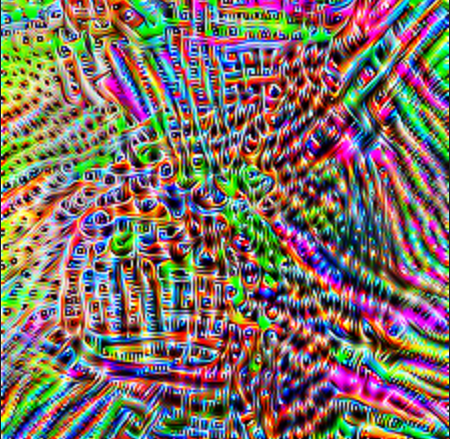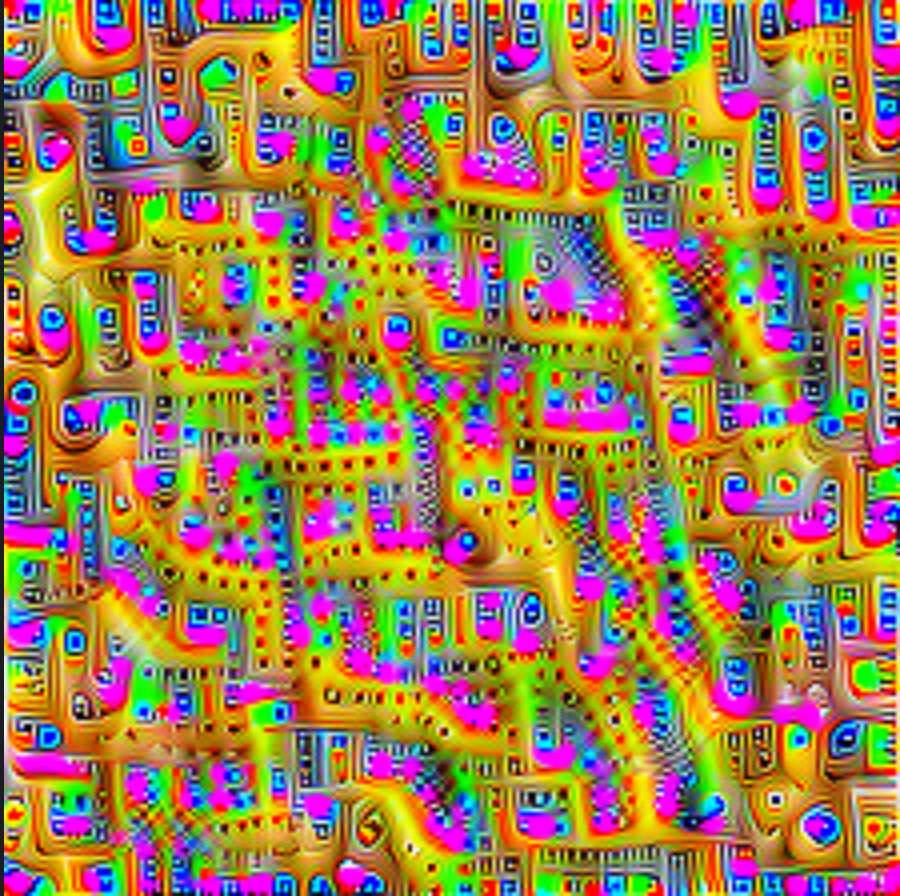 Here’s a picture to illustrate this. If VGG19 is a good model of primary visual cortex, then it follows that maximizing predicted activity in primary visual cortex could be done by maximizing an unweighted sum of VGG19 subunits, a la DeepDream. If you do that for layer 7 of VGG19, you get the picture on the left. However, we can use fMRI to estimate a matrix, via ridge regression that maps VGG19 to an fMRI subspace, and then optimize a weighted sum of VGG19 subunits, giving us the picture on the right. This image highlights some of the known spatial biases in primary visual cortex – shifts in preferred spatial frequency as a function of eccentricity, radial bias, and curvature bias in the fovea – which are not apparent in an unweighted VGG19. So at the very least, the brain’s image manifold is rotated and rescaled compared to the VGG19 image manifold.