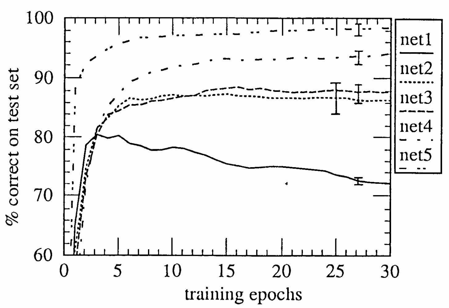 LeCun (1989) demonstrates the use of backpropagation to train a convolutional image recognition network. There’s a beautiful figure that highlights the effect of adding more and more constraints, in particular in going from a fully-connected 2-layer network (net2) to a high-capacity convolutional neural net (net5):